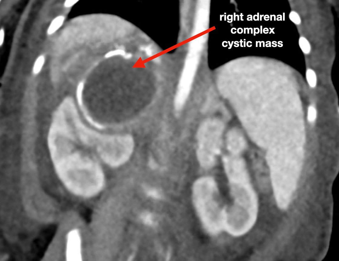 Neonatal Adrenal Hemorrhage, Abscess and Pseudohypoaldosteronism. CT Coronal. Annotated. JETem 2021By JETem / July 12, 2023