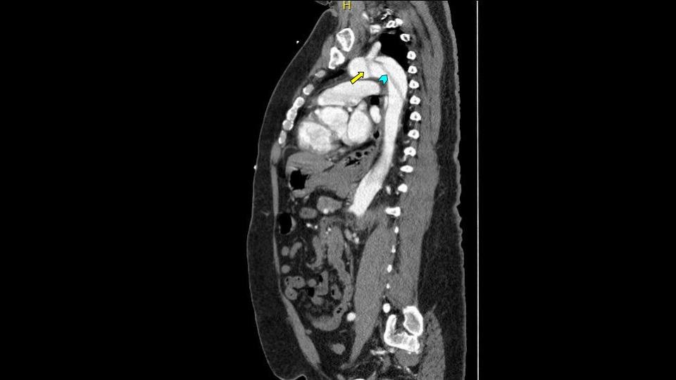 Aortic Dissection Involving the Aortic Root, Left Common Carotid Artery, and Iliac Arteries Images. CT Annotated Sagital. JETem 2022By JETem / July 12, 2023