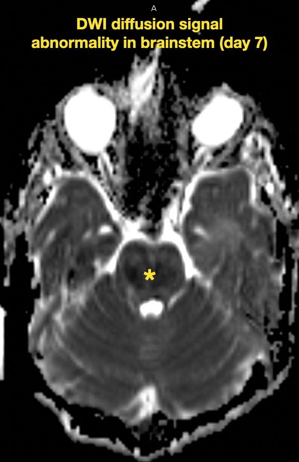 Pediatric Autoimmune Encephalitis. DWI diffusion signal abnormality in brainstem (day 7). Annotated. JETem 2022By JETem / July 12, 2023