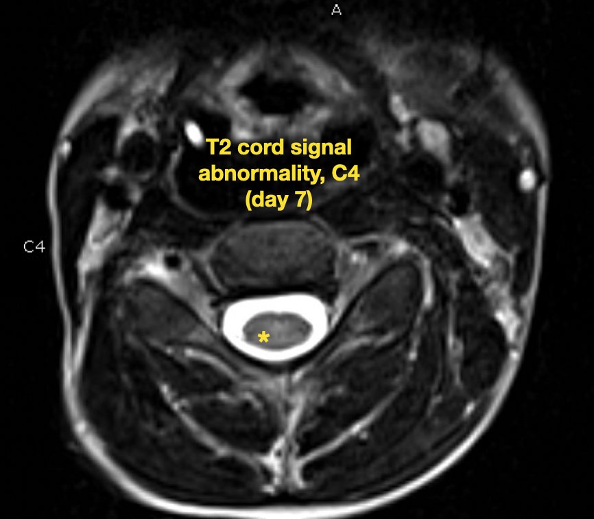 Pediatric Autoimmune Encephalitis. T2 cord signal abnormality. C4 (day 7). Annotated. JETem 2022By JETem / July 12, 2023