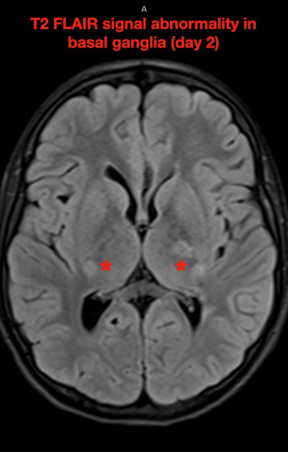 Pediatric Autoimmune Encephalitis. T2 FLAIR signal abnormality in basal ganglia (day 2). Annotated. JETem 2022By JETem / July 12, 2023