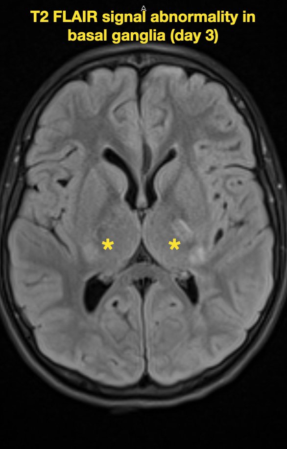Pediatric Autoimmune Encephalitis. T2 FLAIR signal abnormality in basal ganglia (day 3). Annotated. JETem 2022By JETem / July 12, 2023