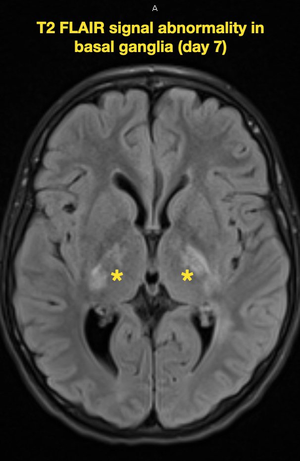 Pediatric Autoimmune Encephalitis. T2 FLAIR signal abnormality in basal ganglia (day 7). Annotated. JETem 2022By JETem / July 12, 2023