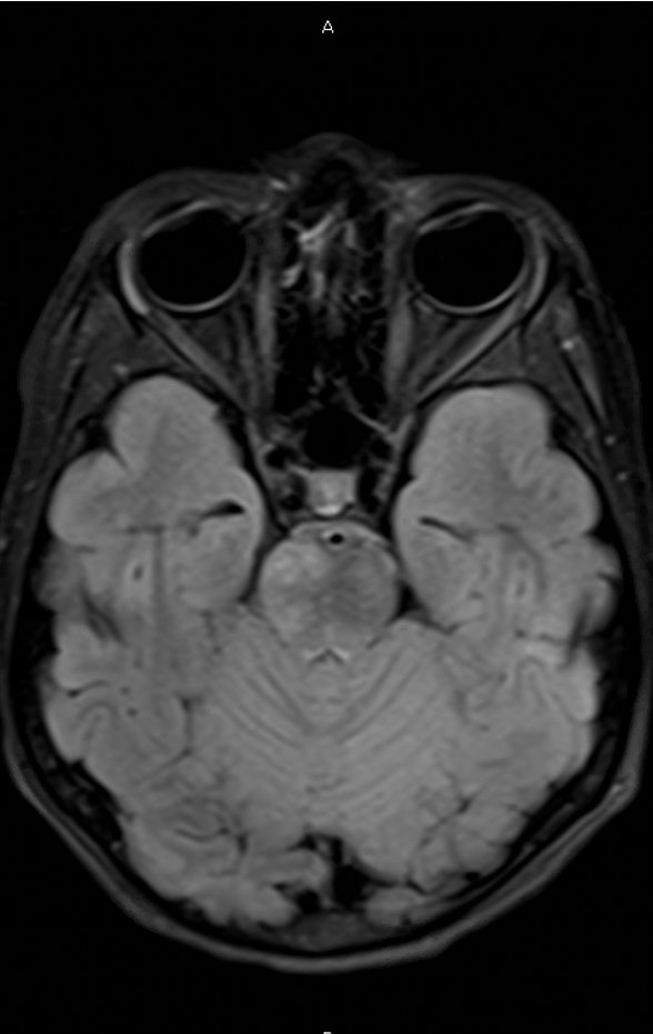 Pediatric Autoimmune Encephalitis. T2 Flair signal abnormality in brainstem (day 2). JETem 2022By JETem / July 12, 2023
