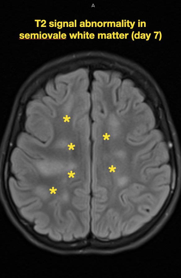Pediatric Autoimmune Encephalitis. T2 signal abnormality in semiovale white matter (day 7). Annotated. JETem 2022By JETem / July 12, 2023