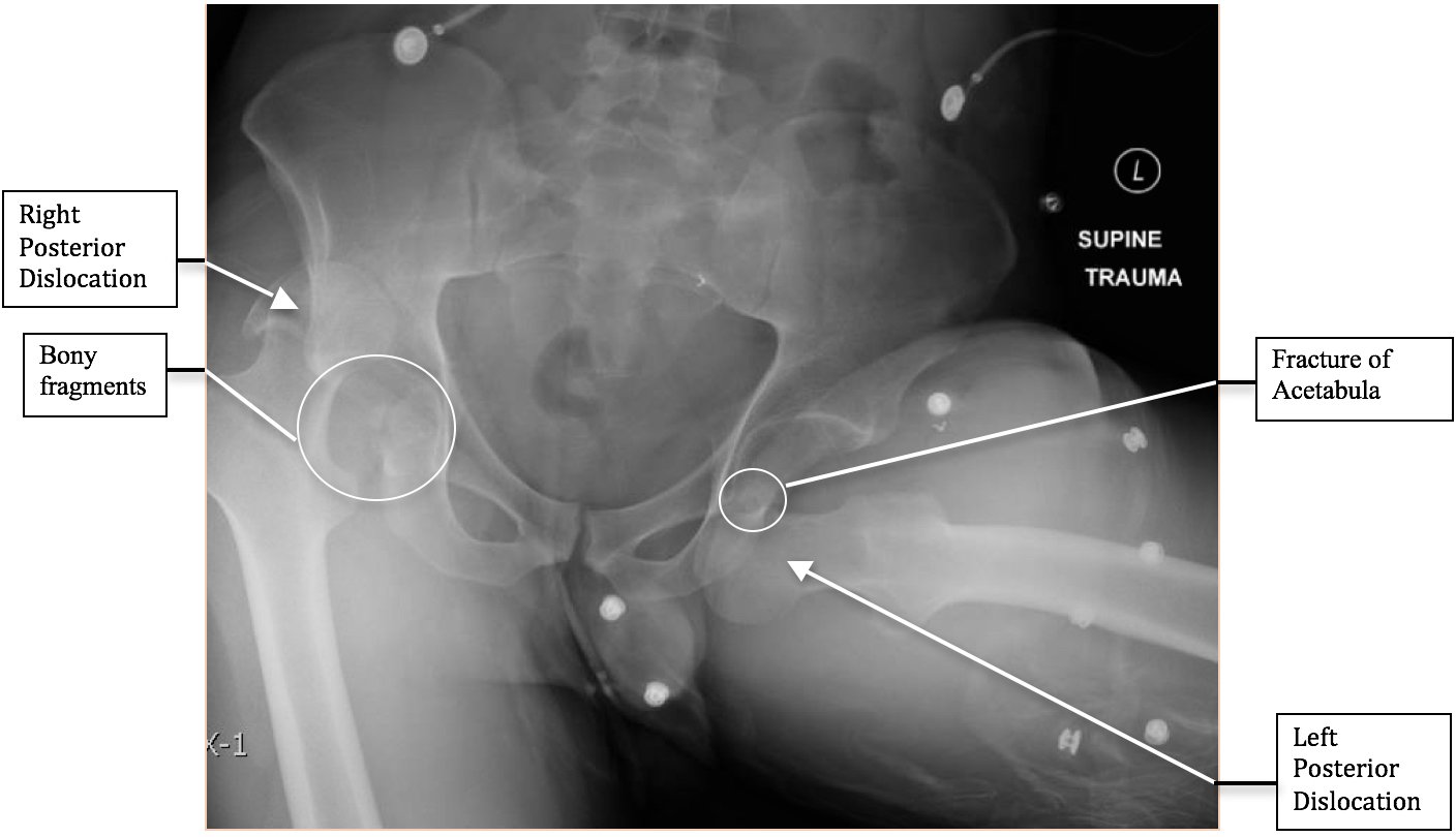 Bilateral Hip Dislocation, Xray, Annotated. JETem 2017