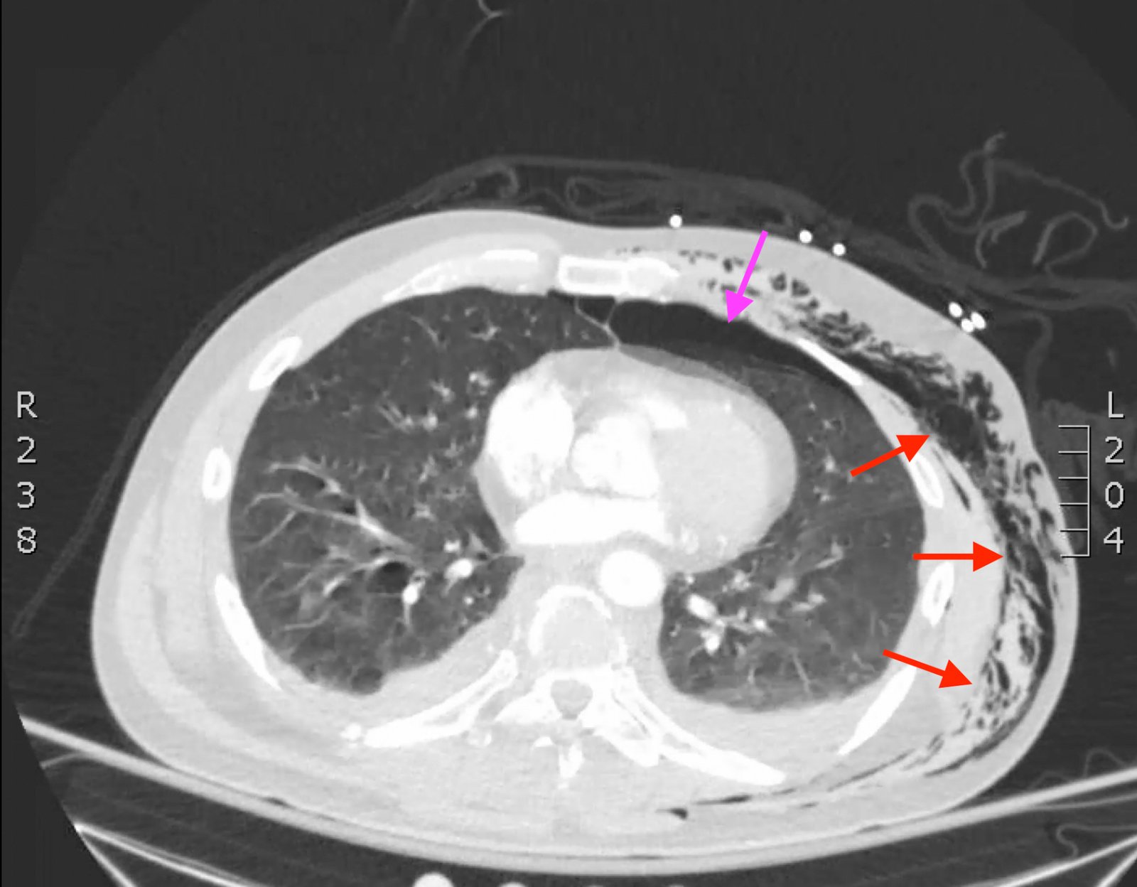 Subcutaneous Emphysema. Axial CT 2, annotated. JETem 2018