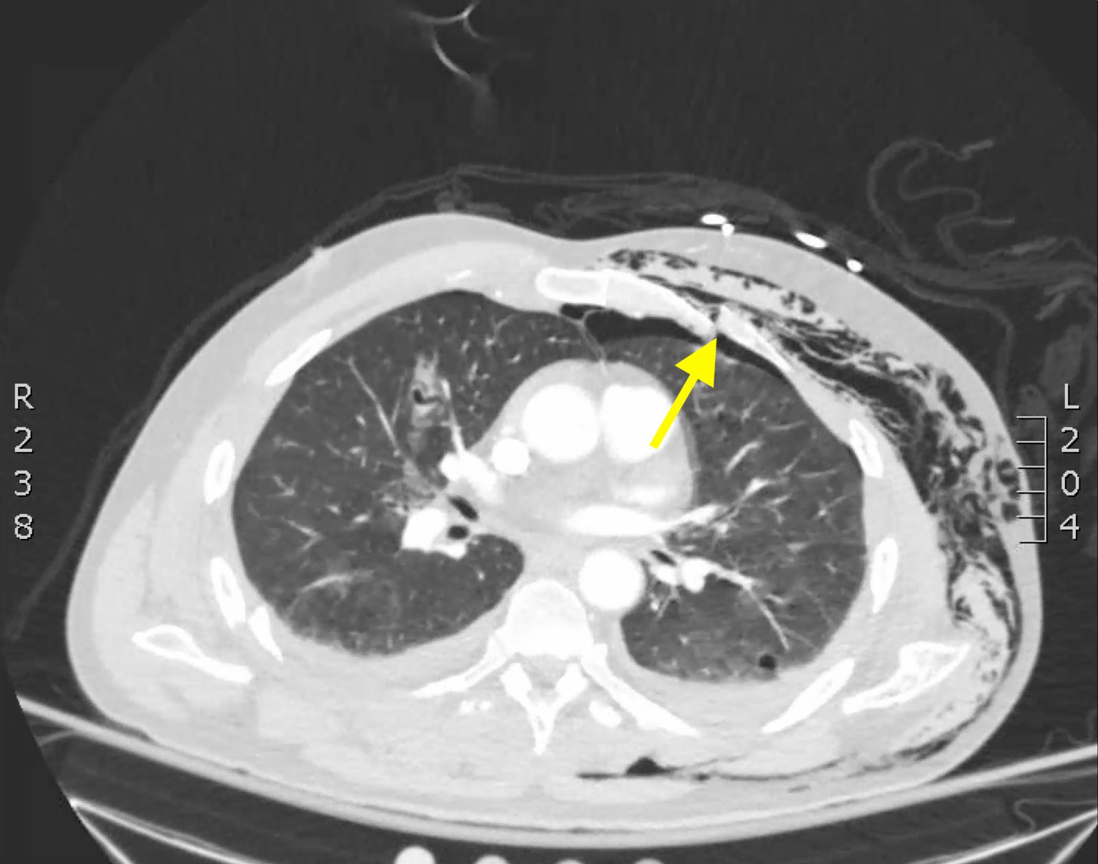 Subcutaneous Emphysema. Axial CT 3, annotated. Rib Fractures. JETem 2018