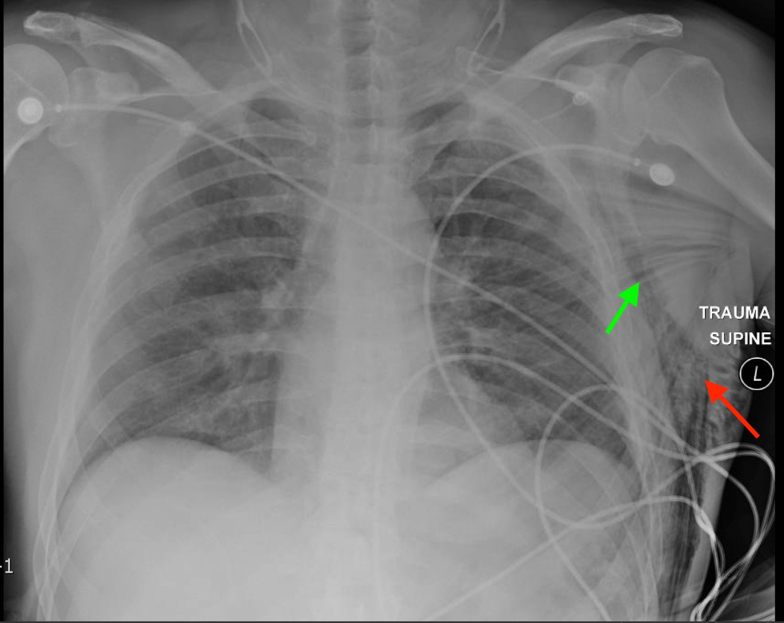 Subcutaneous Emphysema. CXR 1, annotated. JETem 2018