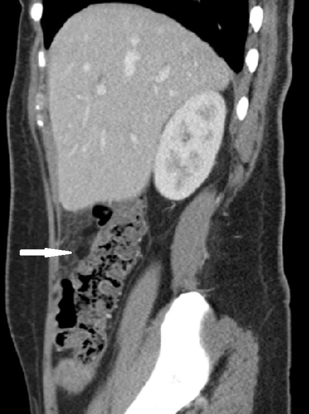 FHC CT Sagital Infrahepatic Stranding Annotated Arrow. JETem 2020
