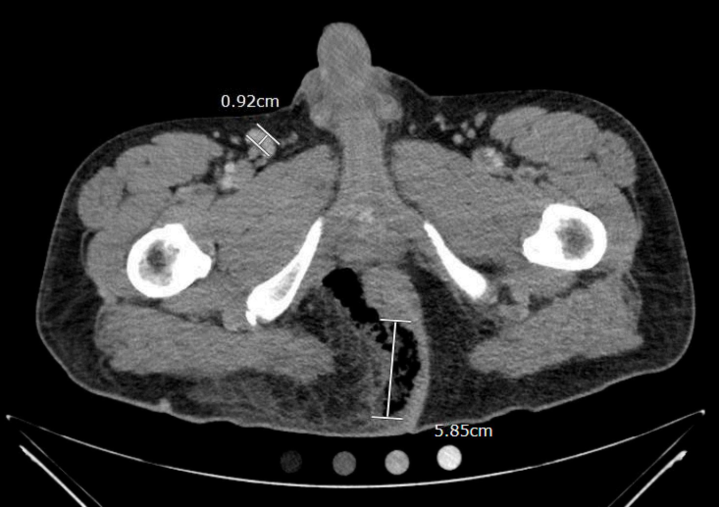 Fournier gangrene. CT still, annotated 2. JETem 2018