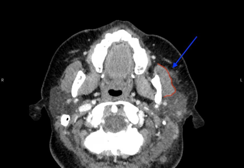 Herpes Zoster Ophthalmicus with Concurrent Parotitis. CT Axial, Annotated. JETem 2023