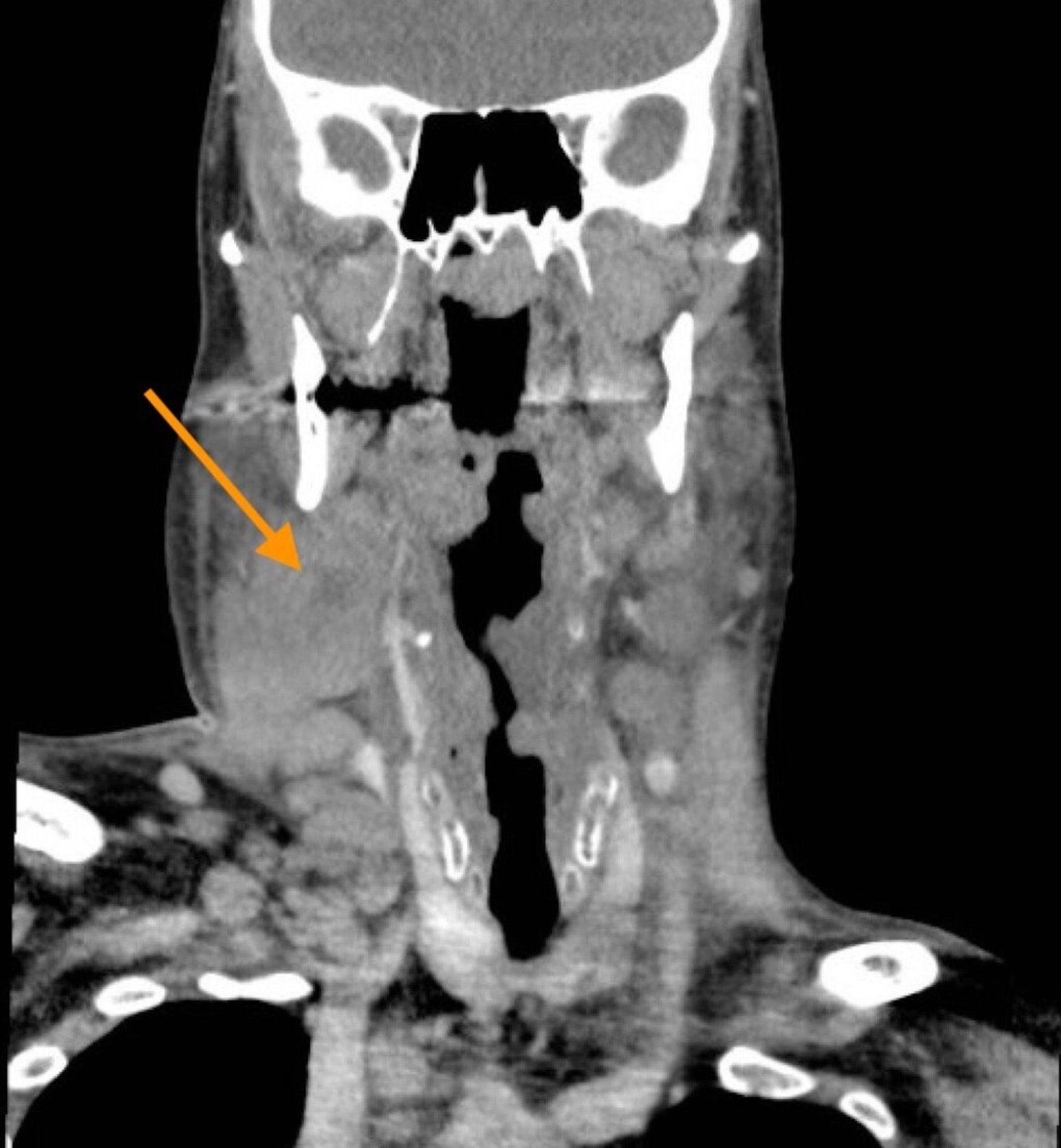 Airway Narrowing Associated with Hodgkin’s Lymphoma Coronal CT Annotated. JETem 2020
