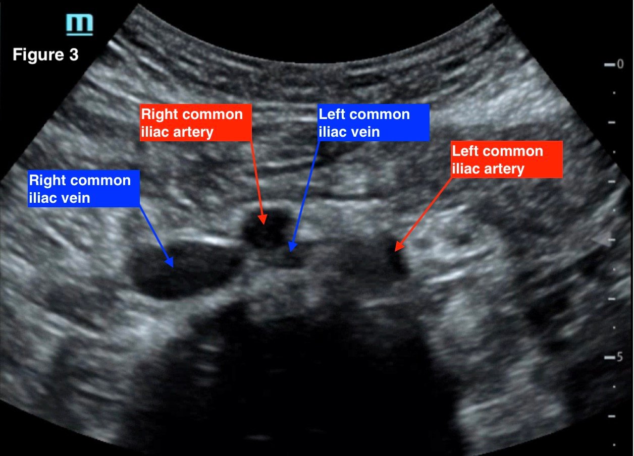 May Thurner. Transverse ultrasound of the abdomen using a curvilinear probe with the indicator towards the patient’s right, annotated. JETem 2022