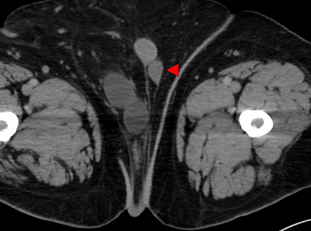 Pelvic Kidney with Ureteral Obstruction from Inguinal Hernia Entrapment and Concurrent Cryptorchid Testis. Normal Left Testis. CT Axial Annotated. JETem 2022By JETem / July 12, 2023