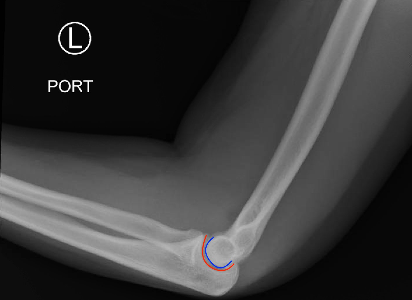 Posterior Elbow Dislocation, Lateral XRay, reduced, Annotated. JETem 2016