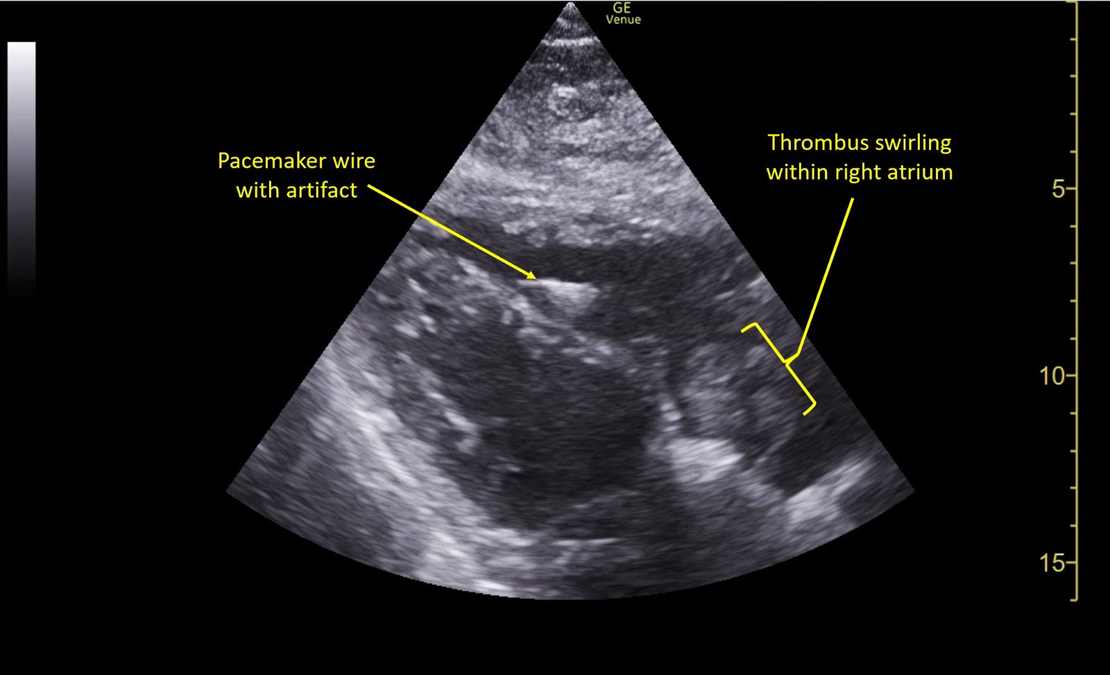 Wolff A, et al. Right atrial thrombosis. Parasternal long US 3, annotated