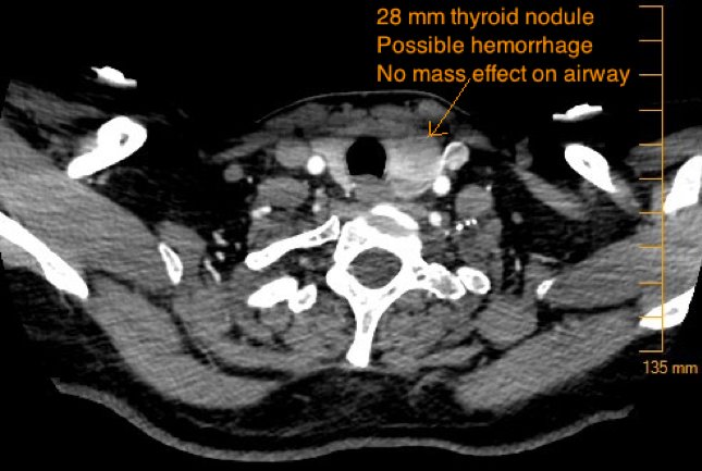Thyroid Hemorrhage. CT Axial 2, Annotated. JETem 2020